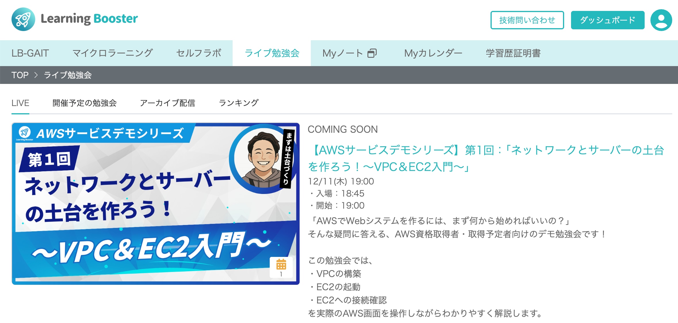 ※開始時間は「ライブ勉強会」タブの「開催予定の勉強会」で確認できます。